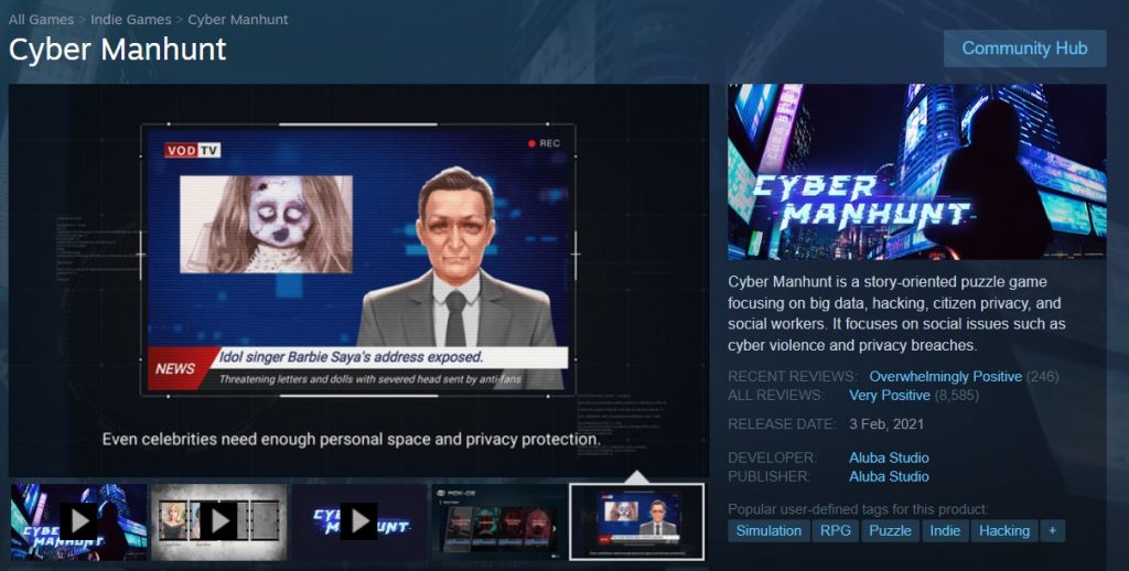 When I played Cyber Manhunt, I was alarmed by the threats to privacy on the Internet. Cyber Manhunt is a game released by Aluba Studio in August 2020. In this game, players can take on the role of hackers and steal information from their targets through the databases of Titan (an Internet company) and even the most common search engine. The privacy of all targets is exposed on the Internet and players can capture door numbers from the background of celebrity selfies or discover tracks from students’ social media. In addition, Titan can provide an excellent database containing information about almost all citizens. As soon as users have leaked enough information online, their real identities, which hide behind the account of platforms, can be found by hackers through this database.