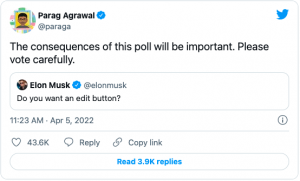This collaboration comes shortly after Twitter announced CEO Jack Dorsey’s replacement late last year with Parag Agrawal, an admirable adversary who critics expected was gearing up to battle heavy hitters such as Musk. Rather than fight in a battle zone and risk missing dinner, perhaps it was Agrawal’s idea to sit calmly with Musk and listen to his needs instead. According to an equity analyst at JMP Securities, Musk is considered a ‘power user,’ who now owns 9.2% of the company (Brown, 2022). The question that remains is whether the vision of Twitter’s future aligns in both men’s heads. (Alas, where is the female figure in all of this?)