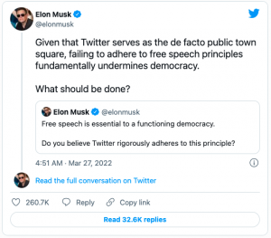 The internet’s flashy headline of the week was the announcement of Elon Musk’s Twitter investment purchase, making him the largest shareholder on the board. While some may read that news and think, ‘Sure, why not, he has the money to buy anything,’ and after the updated report of stock value, Twitter is likely thinking Musk is similar to King Midas, it is important to recall Musk’s history with the controversial platform, and all of the steps that led up to this momentous deal. Given that Musk and Twitter have been at odds for almost the entirety of their relationship, it begs to question what moral and ethical decisions were considered when Musk was approved to purchase Twitter stock and gain a board seat. Could a Big Tech giant like Twitter remain just and unbiased in its moderation of all users, if one of them happens to be a large powerhouse user and ‘passive’ board member?