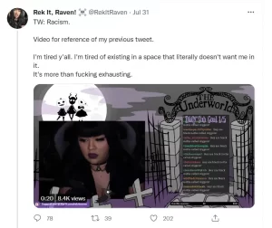 Raven complained that this was not the first time this had happened and that she had become overwhelmed with the increasing frequency since June. In July, seeking help, Raven posted a live video to Twitter in which the comments section of the studio was filled with racial slurs: “Hey, are black goths called Giggers?”