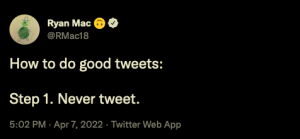 @RMac18. (2022, April 7). How to do good tweets: Step 1. Never tweet. [Tweet]. Retrieved from https://twitter.com/RMac18/status/1512098586737070082?s=20&t=BrmvgQsXMEfrDuWGvPBg9w