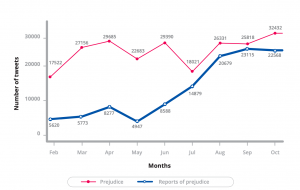 Coronavirus disease pandemic has exacerbated users’ “disgust sensitivity” and xenophobia psychology, and between the two have increase positive correlation. Its epidemic has exacerbated people’s fear and anxiety about life, negative emotions lead to perpetrators of online hate speech may be in the same ill-health and accompanying trauma as their victims. And then, they will vent their anxiety about reality online by attacking others (Baggs 2021). UK youth charity Ditch the Label posted 50.1 million discussions or examples of racist hate speech in a study of 263 million social media conversations in the UK and US between 2019 and mid-2021, compared to pre-pandemic up 20%. (Ditch the Label 2021). Virus caused by disease contributes to the development of hate culture. More and more people are willing to find groups with the same cultural attributes as themselves on the Internet and establish a sense of cultural identity between groups. As such, minorities make up the vast majority of victims of online hate speech. In addition, the outbreak of the new crown epidemic in recent years has caused hate speech about people infected with the virus to begin to ferment on the Internet, and it has spread widely. Public discussions about online hate speech increased by 38%, and online anti-Asian hate speech significant increased by 1662% (Ditch the Label 2021).