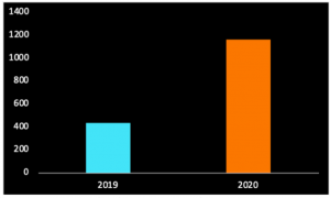 It shows the number of misogynistic Facebook posts published by UN Women in 2019 and 2020 targeting the South and South-East Asia region. There has been a significant increase in hate speech between these two years.
