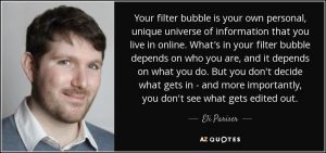 Eli Pariser coins the term filter bubble. In his TED speech, Pariser (2011) argues that “as web companies strive to tailor their services (including news and search results) to our personal tastes, there’s a dangerous unintended consequence: we get trapped in a filter bubble and do not get exposed to information that could challenge or broaden our worldview”. He insists that the filter bubble will ultimately prove detrimental to us and democracy.