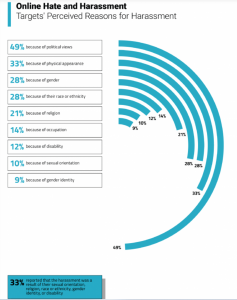 The Anti-Defamation League (2021) survey found that a third of respondents said their harassment had something to do with their identity. Political opinions, race, appearance and gender are all very high targets’ perceived reasons for harassment.