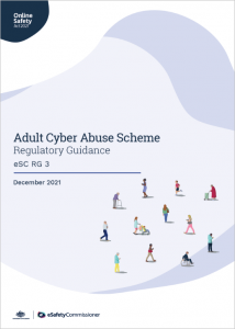 - eSafetyCommissioner. (2021). Adult Cyber Abuse Scheme Regulatory Guidance. Retrieved 9 April, 2022, from https://www.esafety.gov.au/sites/default/files/2022-03/Adult%20Cyber%20Abuse%20Scheme%20Regulatory%20Guidance.pdf